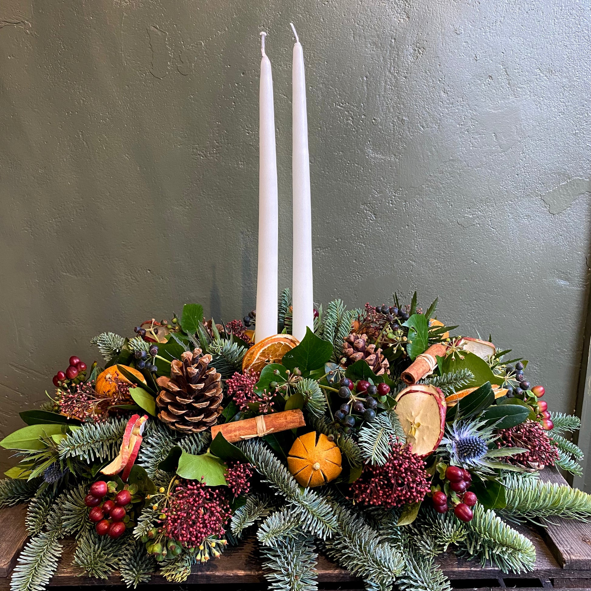 Wild and natural feeling, this table arrangement is available in different sizes and is perfect for Christmas Day. Comes with Tapered candles.