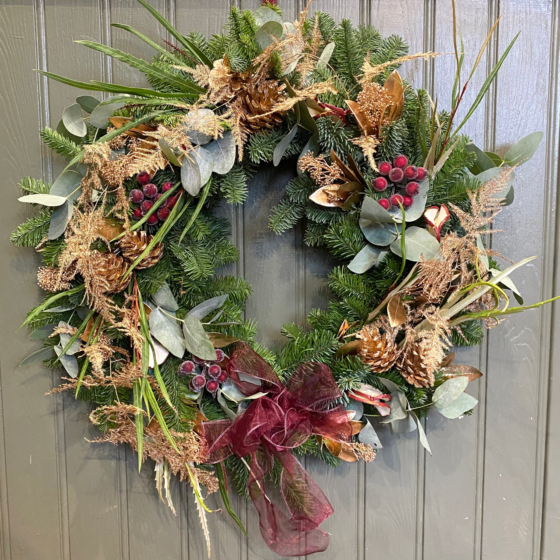 Bright, bold and fun, this Christmas Wreath showcases the most traditional of colours: red, gold and green. Created on a Pine base, this wreath includes textured golden foliages and filler flowers, finished with a red luxury bow.