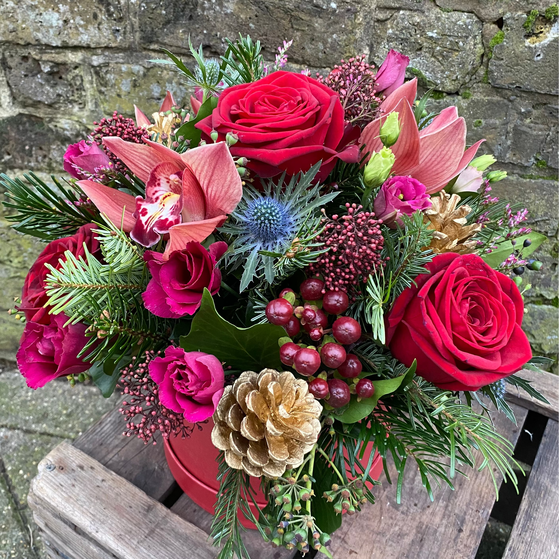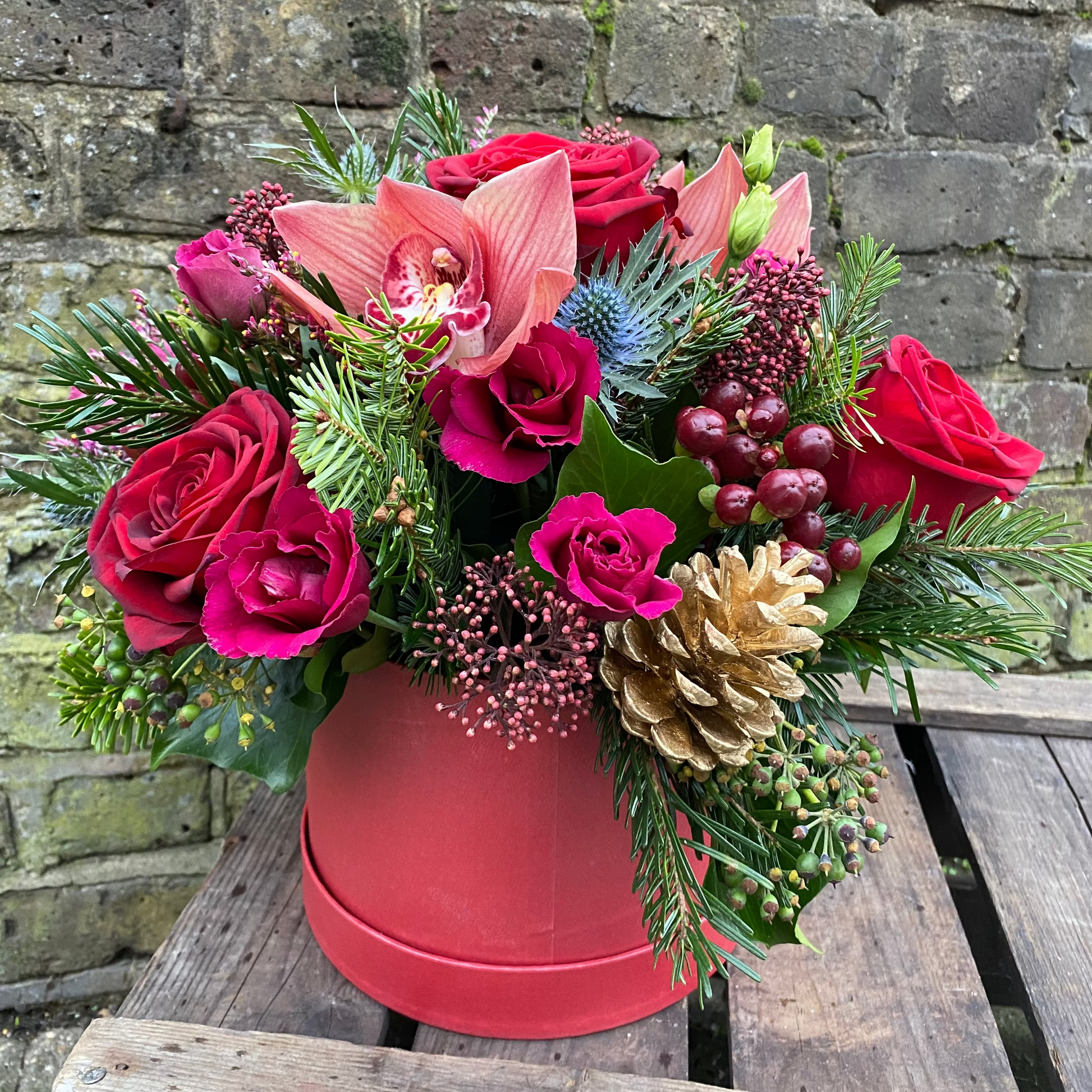 A beautiful festive gift - with a twist! This expertly crafted floral arrangement features all the seasonal classics: Red Roses, Berries and Thistle. These flowers will dress the home perfectly during the colder months or make the perfect gift. The flowers are displayed within a floral foam and placed into the hat box.